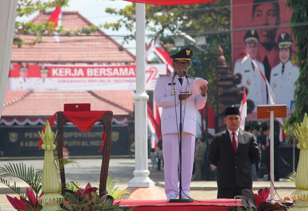 Hal diatas disampaikan Bupati Purbalingga, Tasdi saat membacakan sambutan Gubernur Jawa Tengah pada upacara detik-detik HUT RI ke 72 di Alun-alun Purbalingga, Kamis (17/8). Pelaksanaan upacara diikuti oleh semua unsur masyarakat anaralain TNI/Polri, organisasi kemasyarakatan, Korpri, Organisasi kepemudaan, organiasi politik, mahasiswa dan pelajar.