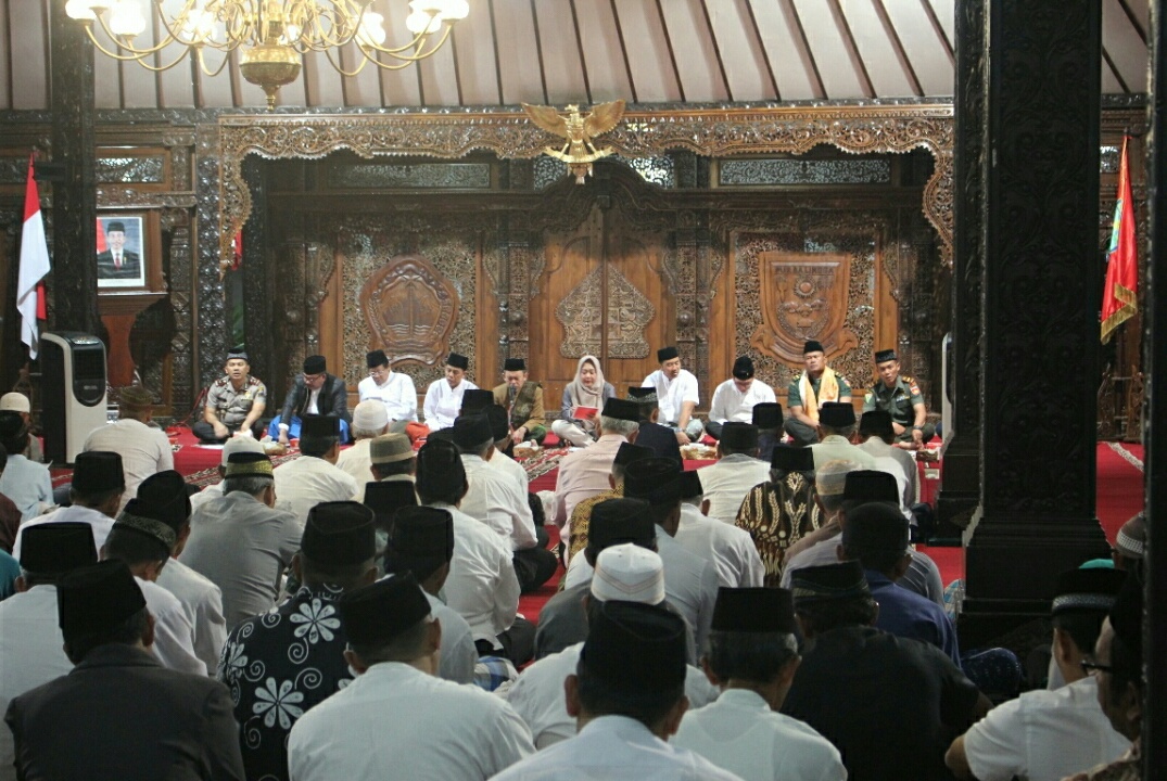 PURBALINGGA – Bupati Purbalingga Dyah Hayuning Pratiwi SE BEcon MM bersama jajaran Forum Komunikasi Pimpinan Daerah (Forkopimda) mengikuti kegiatan Khotmil Quran, Istighotsah dan Pengajian Rutin setiap Jumat Kliwon Malam, (14/8) di Pendopo Dipokusumo. Kegiatan yang masih dalam suasana kemerdekaan ini, Bupati Tiwi mengajak untuk bersyukur atas kemerdekaan RI yang telah diraih sejak 74 tahun silam ini.