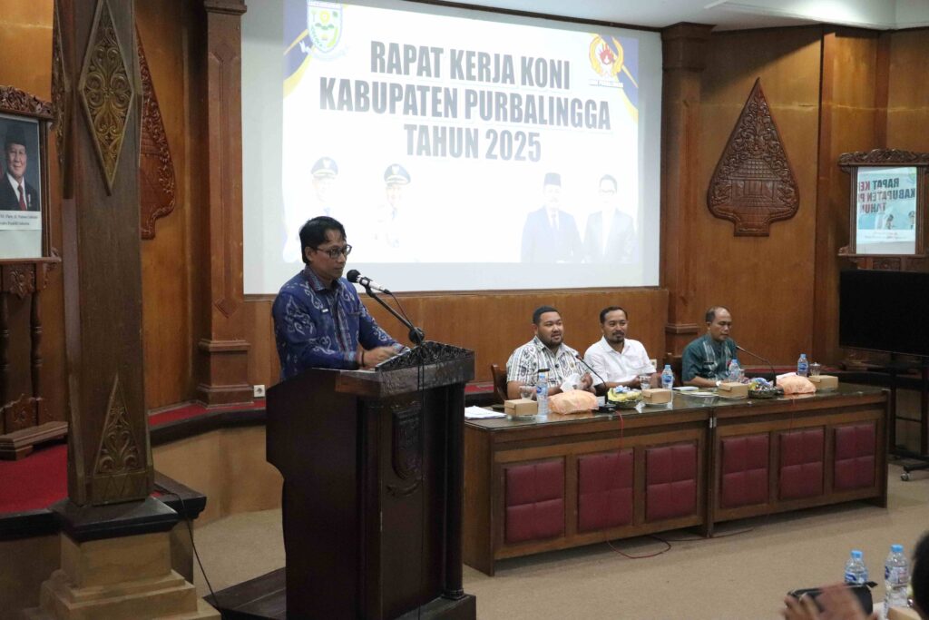 Ketua KONI Purbalingga, R. Budi Setiawan saat memberikan sambutan pada pembukaan Rakor KONI Kabupaten Purbalingga tahun 2025