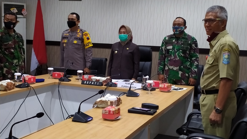 di Posko Penanganan dan Penanggulangan Covid-19 Provinsi Jawa Tengah, Gedung Gradhika Bhakti Praja, Kompleks Kantor Gubernur Jawa Tengah, sementara Bupati Tiwi bersama Tim Gugus Tugas megikuti dari Ruang Rapat Bupati Purbalingga.