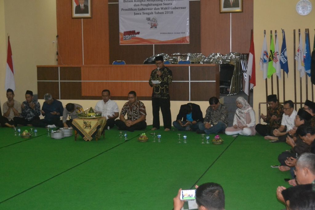 PURBALINGGA – Para stakeholder yang terdiri dari unsur Komisi Pemilihan Umum Daerah (KPUD), Panitia Pengawas Pemilu (Panwaslu), Forum Kordinasi Pimpinan Daerah (Forkopimda), Forum Kordinasi Pimpinan Kecamatan (Forkopimcam), dan tokoh semua agama menggerlar doa bersama di Aula KPU Kabupaten Purbalingga, Selasa (26/7). Kegiatan ini bertujuan guna bersama-sama memohon kepada Tuhan Yang Maha Esa untuk kelancaran kegiatan pemungutan suara Pemilihan Gubernur (Pilgub) yang akan diselenggarakan keesokan harinya, agar tidak terjadi hal yang mengganggu kondusifitas dan keabsahan pesta demokrasi ini.