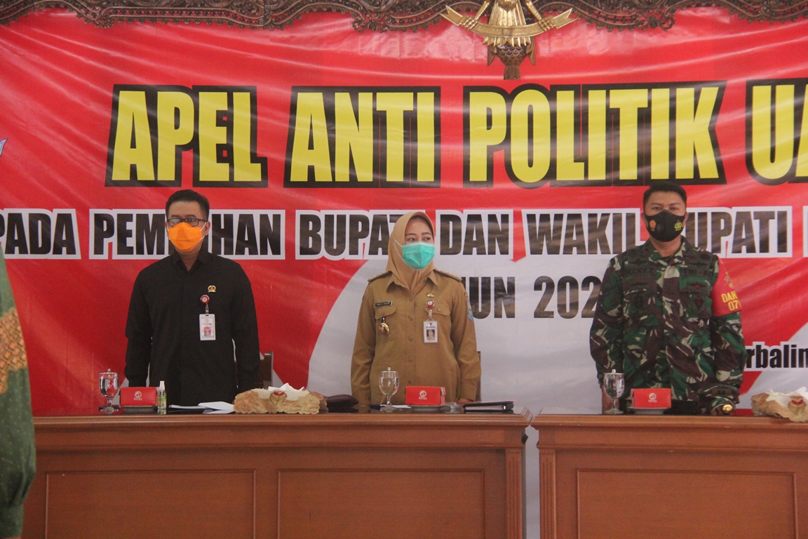 Dalam Apel Anti Politik Uang, yang berlangsung di pendopo Dipokusumo, Senin (07/12) juga diikuti secara virtual di 18 kecamatan. Hadir dan memberikan arahan, Kepala Kejaksaan Negeri Lalu Syaifudin, SH MH., Dandim 0702 Letkol Inf. Decky Zulhas SH MHan., Ketua DPRD Purbalingga HR Bambang Irawan SH dan Bupati Dyah Hayuning Pratiwi SE BEcon MM.