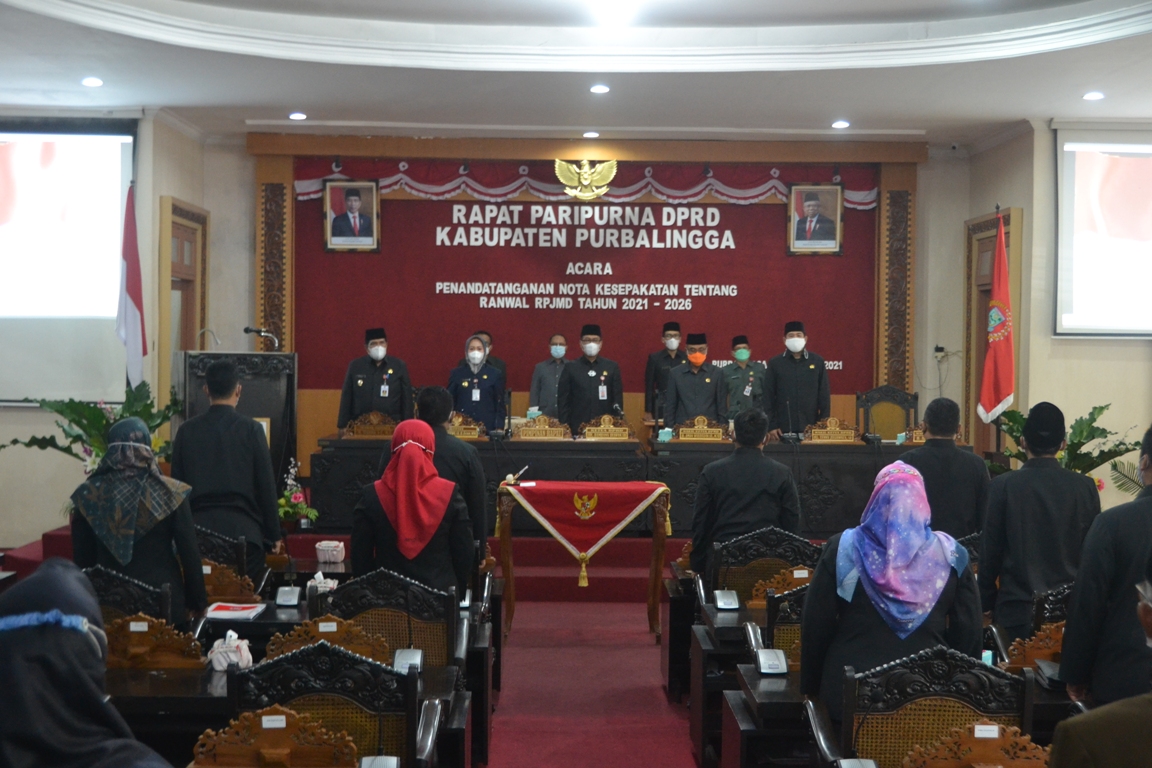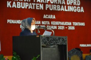 PURBALINGGA – DPRD bersama Pemkab Purbalingga menandatangani Nota Kesepakatan tentang Rancangan Awal (Ranwal) Rencana Pembangunan Jangka Menengah Daerah Kabupaten Purbalingga (RPJMD) Tahun 2021 – 2026, Jumat (30/4) di Ruang rapat DPRD. Ketua Badan Anggaran (Banggar) DPRD Kabupaten Purbalingga, H Bambang Irawan SH melalui juru bicara Hj Yuniarti SH menyampaikan enam saran terhadap Ranwal RPJMD 2021 – 2026 tersebut.