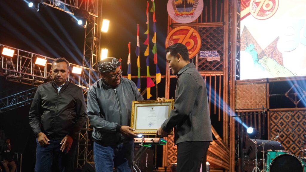 Bupati Fahmi menyerahkan piagam KEN dari Kemenpar kepada Kepala Desa Serang, Sugito