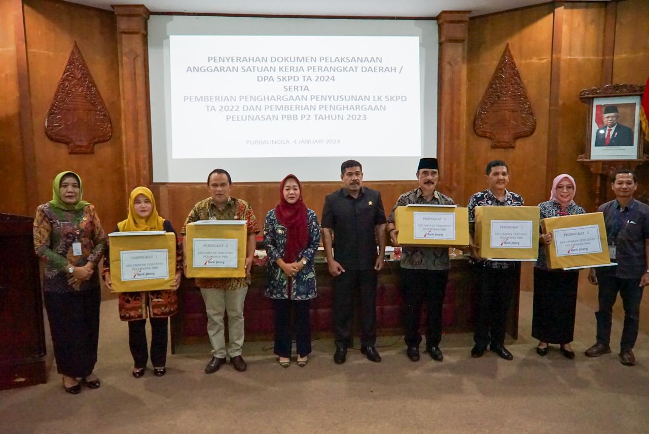 Bupati Purbalingga Dyah Hayuning Pratiwi (Tiwi) mengapresiasi capaian penerimaan PBB-P2 tahun 2023 tersebut dan memberikan penghargaan kepada kecamatan dan desa/kelurahan atas optimalisasi penerimaan PBB-P2 tahun 2023. Pemberian penghargaan berlangsung di Operation Room Graha Adiguna Purbalingga, Kamis (4/1/24).
