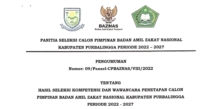 Pengumuman Hasil Seleksi Kompetensi dan Wawancara Penetapan Calon Pimpinan Baznas Kab. Purbalingga