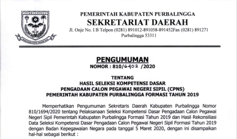 Purbalingga (23/03) Berdasarkan surat Ketua Panitia Seleksi Instansi Pengadaan PNS Pemerintah Kabupaten Purbalingga Tahun 2019 nomor 810/6402/2020 Tentang Hasil Seleksi Kompetensi Dasar Pengadaan Calon Pegawai Negeri Sipil (CPNS) Pemerintah Kabupaten Purbalingga Formasi Tahun 2019, bersama ini dengan hormat kami sampaikan hasil Seleksi Kompetensi Dasar Pengadaan Calon Pegawai Negeri Sipil :