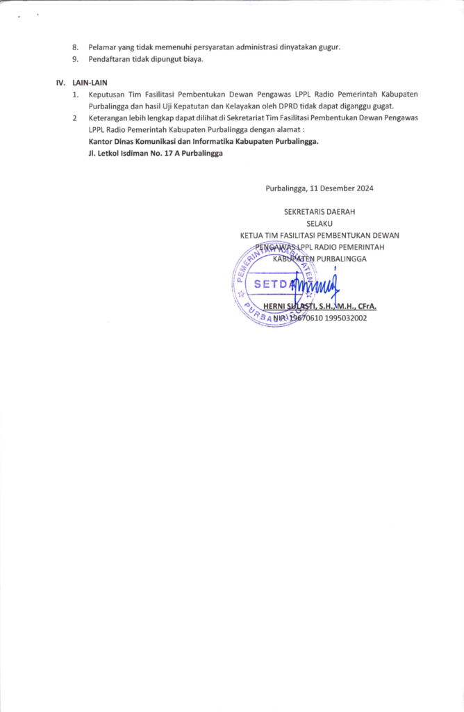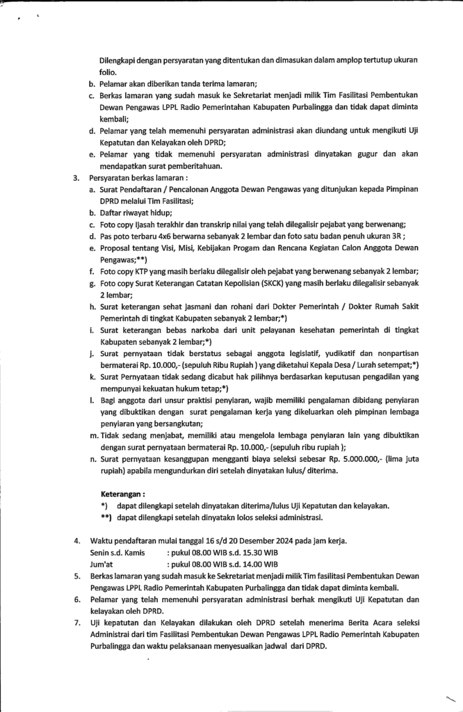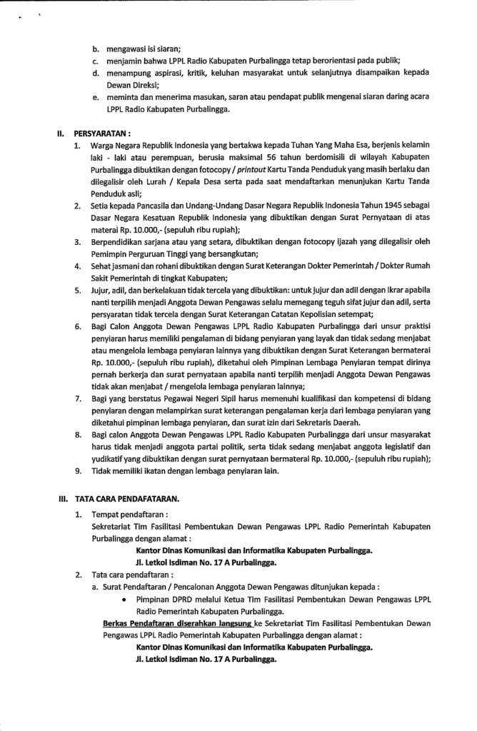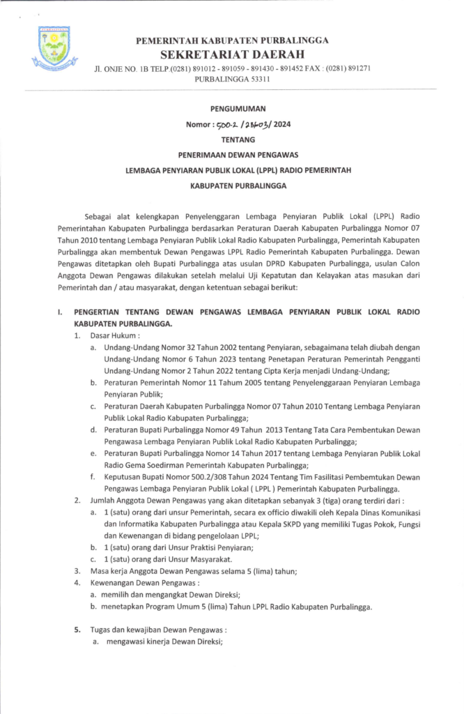 Dewan Pengawas ditetapkan oleh Bupati Purbalingga atas usulan DPRD Kabupaten Purbalingga, usulan Calon Anggota Dewan Pengawas dilakukan setelah melalui Uji Kepatutan dan Kelayakan atas masukan dari Pemerintah dan / atau masyarakat, ketentuan penerimaan Dewan Pengawas LPPL Radio Pemerintah Kabupaten Purbalingga dapat dilihat pada link berikut: Penerimaan Dewan Pengawas LPPL Radio Pemerintah Kab. Purbalingga