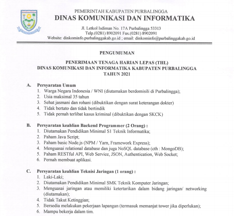- Warga Negara Indonesia / WNI (diutamakan berdomisili di Purbalingga);