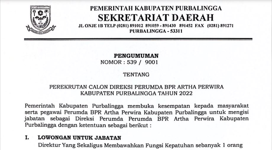 Pengumuman Perekrutan Calon Direksi Perumda BPR Artha Perwira Kab. PurbalinggaPosted by Dinkominfo | May 17, 2022 | Pengumuman | 0 | Informasi selengkapnya dapat dilihat disini