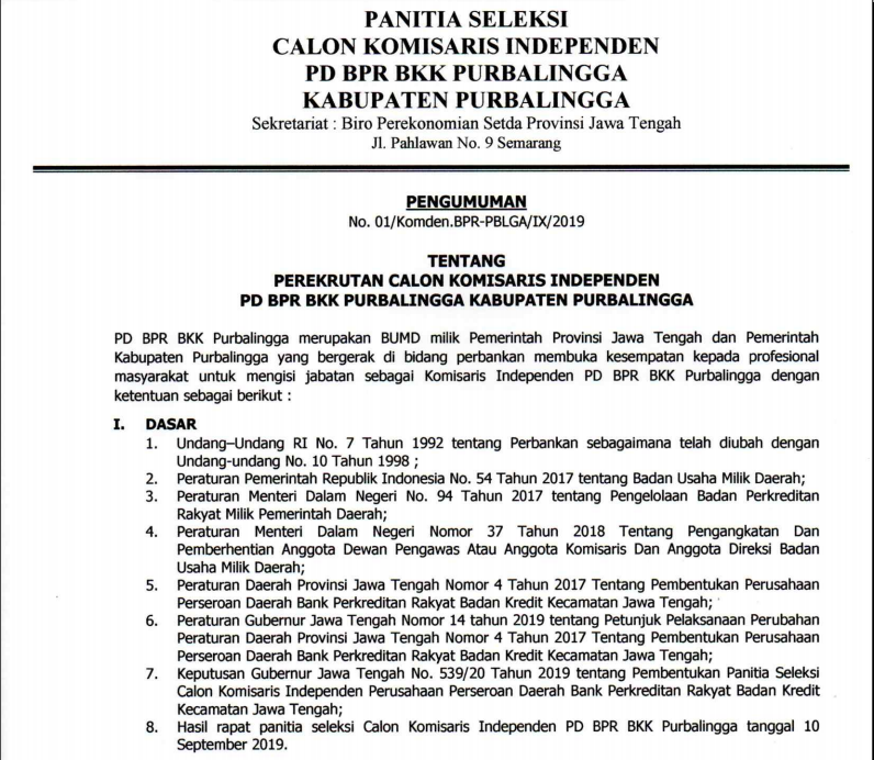 PEREKRUTAN CALON KOMISARIS INDEPENDEN PD BPR BKK PURBALINGGA