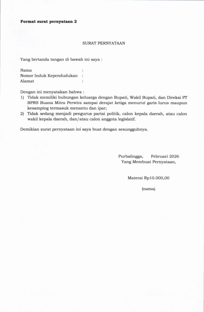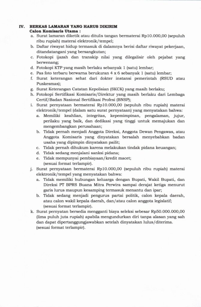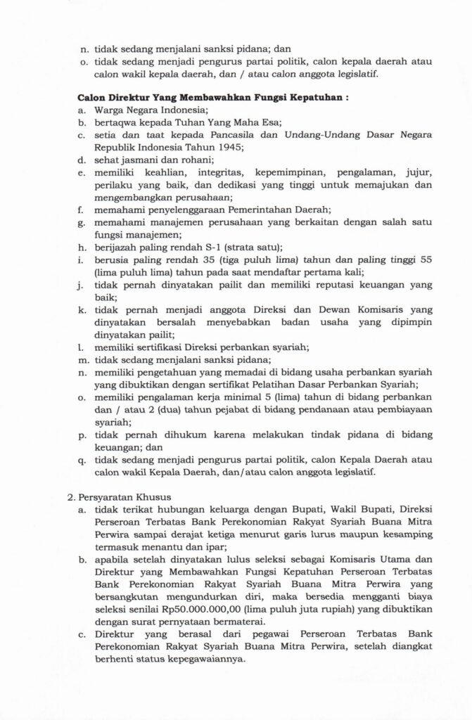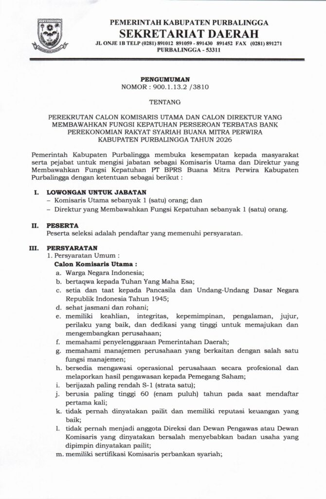 PENGUMUMAN SELEKSI CALON KOMISARIS UTAMA DAN DYMFK PT BPRS BUANA MITRA PERWIRA TAHUN 2026Posted by Dinkominfo | Feb 20, 2026 | Berita | 0 | download pdf di link disini