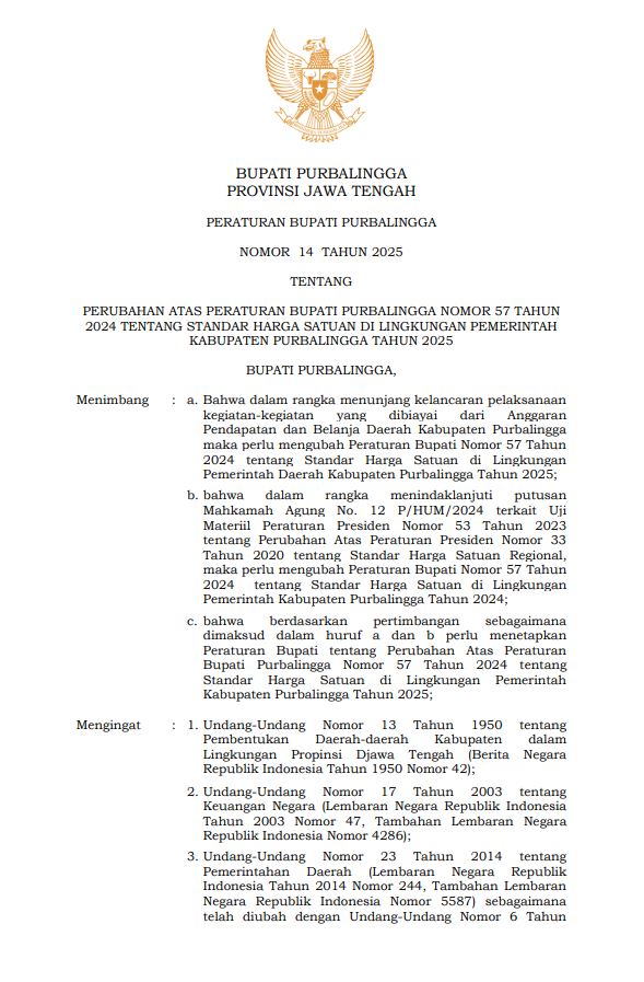 - Judul : PERATURAN BUPATI PURBALINGGA NOMOR 14 TAHUN 2025 PERUBAHAN ATAS PERATURAN BUPATI PURBALINGGA NOMOR 57 TAHUN 2024 TENTANG STANDAR HARGA SATUAN DI LINGKUNGAN PEMERINTAH KABUPATEN PURBALINGGA TAHUN 2025