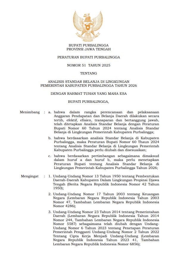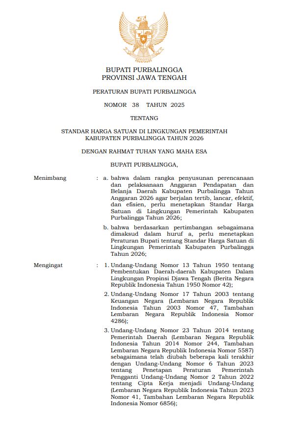 - Judul : PERATURAN BUPATI PURBALINGGA NOMOR 38 TAHUN 2025 TENTANG STANDAR HARGA SATUAN DI LINGKUNGAN PEMERINTAH KABUPATEN PURBALINGGA TAHUN 2026