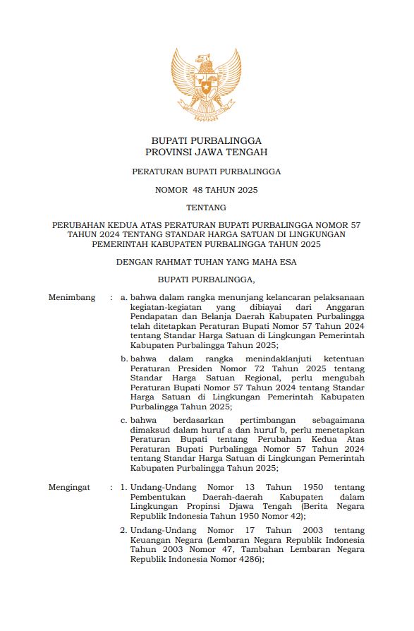 - Judul : PERATURAN BUPATI PURBALINGGA NOMOR 48 TAHUN 2025 TENTANG PERUBAHAN KEDUA ATAS PERATURAN BUPATI PURBALINGGA NOMOR 57 TAHUN 2024 TENTANG STANDAR HARGA SATUAN DI LINGKUNGAN PEMERINTAH KABUPATEN PURBALINGGA TAHUN 2025