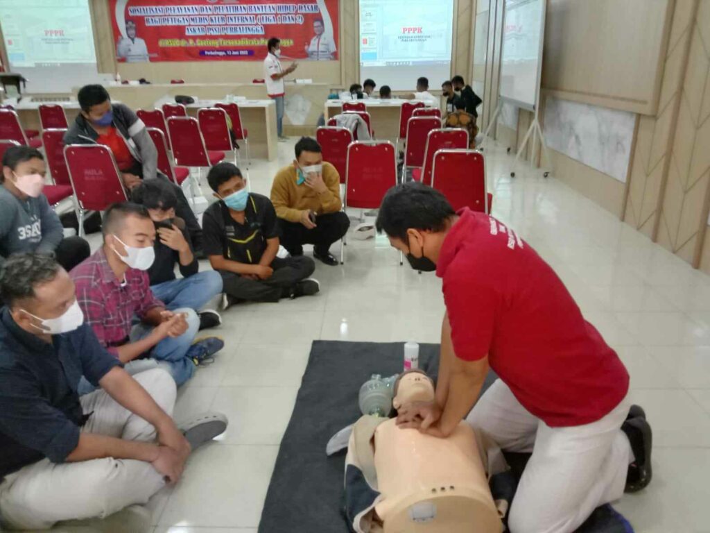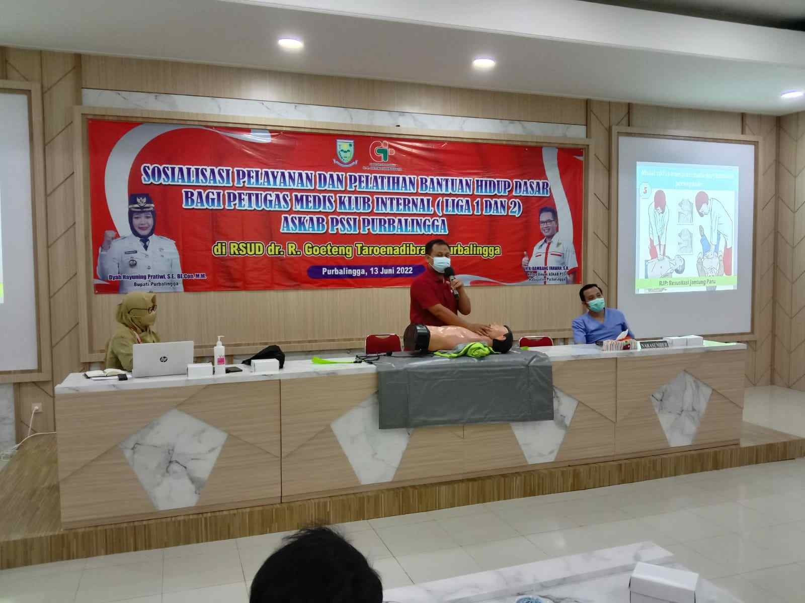 PURBALINGGA, INFO- Pertolongan pertama ketika seorang atlet mengalami cedera harus dilakukan dengan benar. Hal tersebut disampaikan dr. Aldera Asa Dinantara, pemateri acara sosialisasi pelayanan dan pelatihan bantuan hidup dasar bagi petugas medis klub internal Liga 1 dan 2 Askab PSSI Purbalingga, Senin (13/6/2022) di aula Laboratorium RSUD R. Goeteng Taroenadibrata Purbalingga.