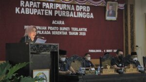 PURBALINGGA – Usai dilantik menjadi Bupati Purbalingga periode 2021 – 2026, Bupati Dyah Hayuning Pratiwi, SE, BEcon, MM menyampaikan Pidato Perdana dihadapan Rapat Paripurna DPRD Purbalingga pada Kamis (4/3).