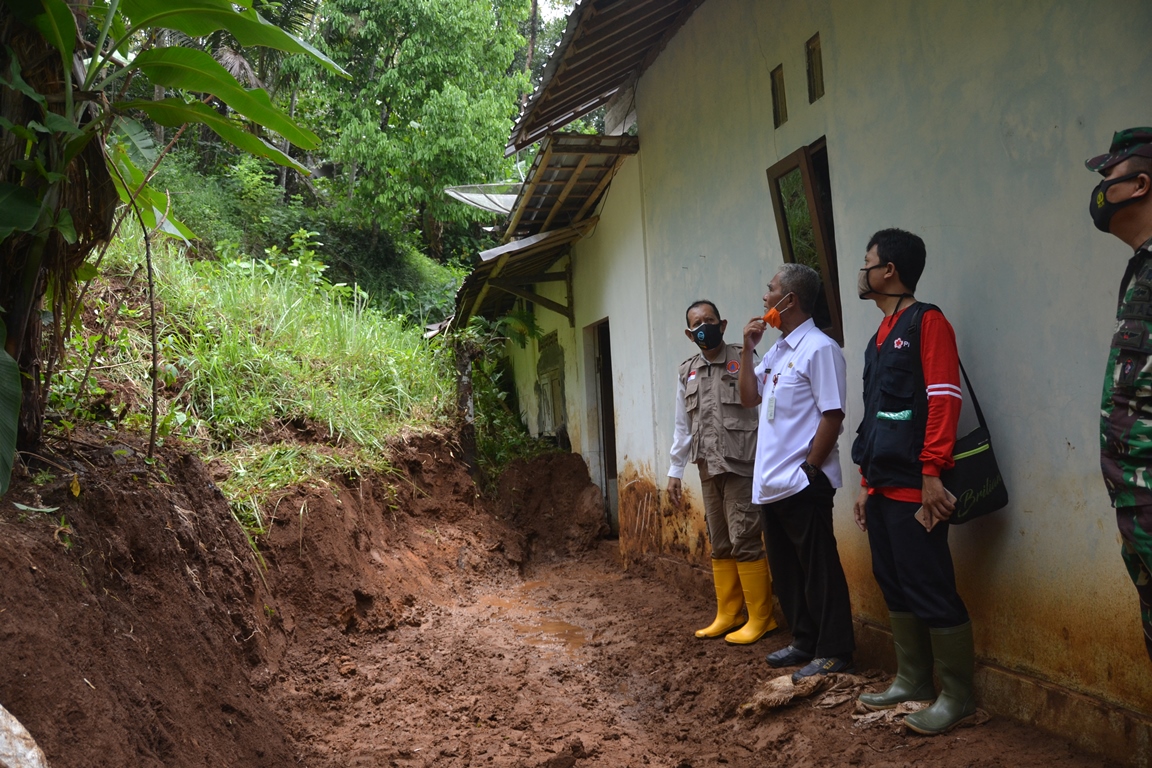 PURBALINGGA – Pjs Bupati Purbalingga Sarwa Pramana SH MSi bersama jajaran Pemkab Purbalingga mengunjungi rumah warga yang terdampak tanah longsor di Desa Tangkisan, Kecamatan Mrebet, Rabu (21/10). Salah satu yang dikunjungi yakni rumah milik Khomsiah Muhiati (45) di RT 01/02.