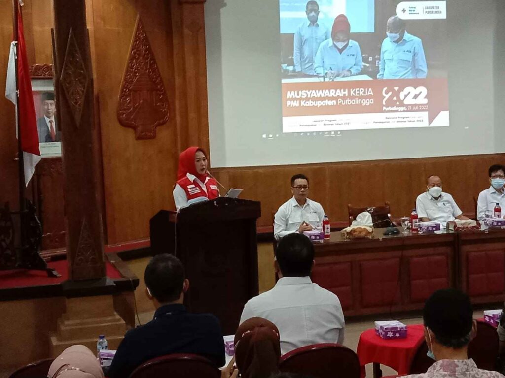 PURBALINGGA INFO- Palang Merah Indonesia (PMI) Jawa Tengah (Jateng) mengapresiasi inovasi yang dilakukan ketua PMI Purbalingga yang juga Bupati Purbalingga Dyah Hayuning Pratiwi. Hal tersebut disampaikan ketua PMI Jateng yang diwakili salah satu pengurusnya Gunawan Permadi saat menyampaikan sambutan pada acara pencanangan bulan dana PMI dan bulan pelajar peduli kemanusiaan serta musyawarah kerja Kabupaten, Jumat (22/7/2022) di Graha Adiguna kompleks Pendapa Dipokusumo Purbalingga.