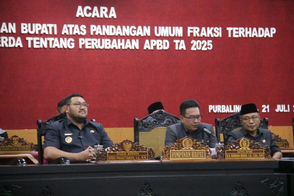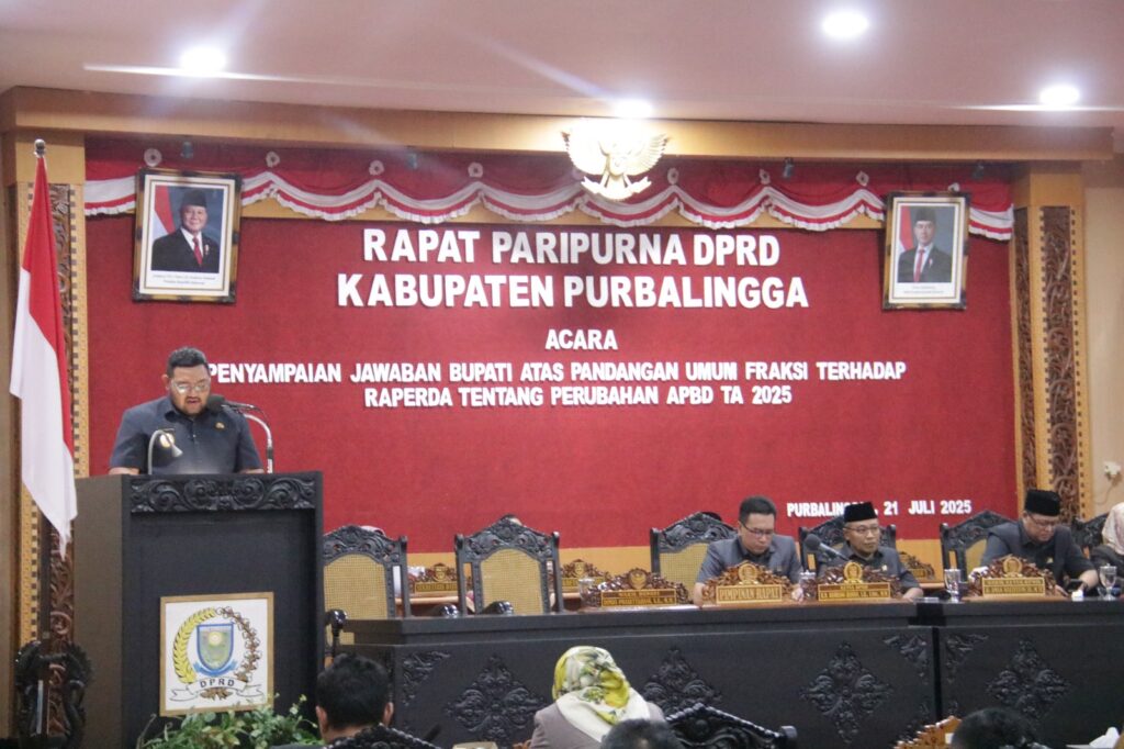 PURBALINGGA INFO – Rapat Paripurna DPRD Kabupaten Purbalingga kembali digelar, Senin (21/7/25) dengan agenda Penyampaian Jawaban Bupati atas Pandangan Umum Fraksi terhadap Raperda Perubahan APBD TA 2025. Rapat dipimpin langsung oleh Ketua DPRD H.R. Bambang Irawan dan dihadiri oleh Plt. Bupati Purbalingga Dimas Prasetyahani, jajaran pimpinan dan anggota DPRD, Sekda Herni Sulasti, para kepala OPD, camat, serta pimpinan BUMN/BUMD.