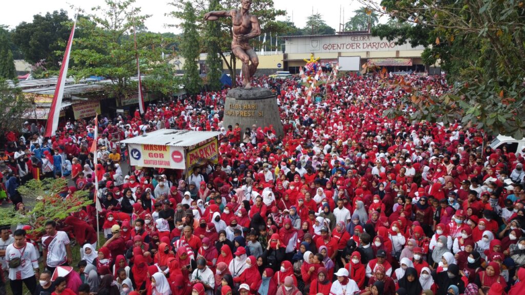 PURBALINGGA INFO – Puluhan ribu warga Kabupaten Purbalingga tumpah ruah dengan pakaian dan atribut merah-putih mengikuti jalan sehat dan senam bersama Bupati Purbalingga, Dyah Hayuning Pratiwi. Start dan finish jalan sehat yang diadakan Sabtu (20/8) pagi bertempat di GOR Goentoer Darjono Purbalingga.