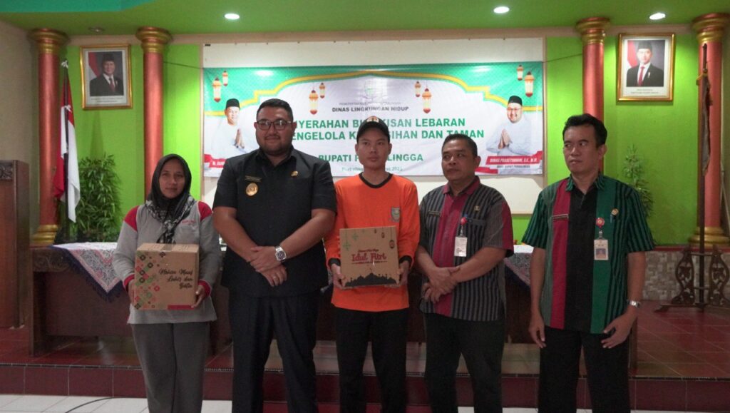 Pada kesempatan tersebut Wabup menyerahkan secara simbolis bingkisan kepada 181 orang terdiri dari petugas pengelola sampah 141 orang meliputi 30 orang tenaga angkutan, 84 orang tenaga sapuan, dan 27 orang tenaga TPA. Selain itu terdapat 33 orang pengelola taman, 1 orang petugas onlimo, 2 orang penjaga kantor dan 4 orang tenaga administrasi kantor. (Hr/prokompim)