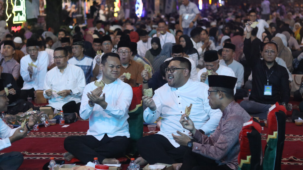 Suasana kebersamaan semakin terasa ketika ribuan peserta serentak menikmati tempe mendoan dan nasi tampah yang telah disediakan. Acara Big Iftar 2025 semakin hangat dengan rangkaian ibadah sholat Maghrib berjamaah.