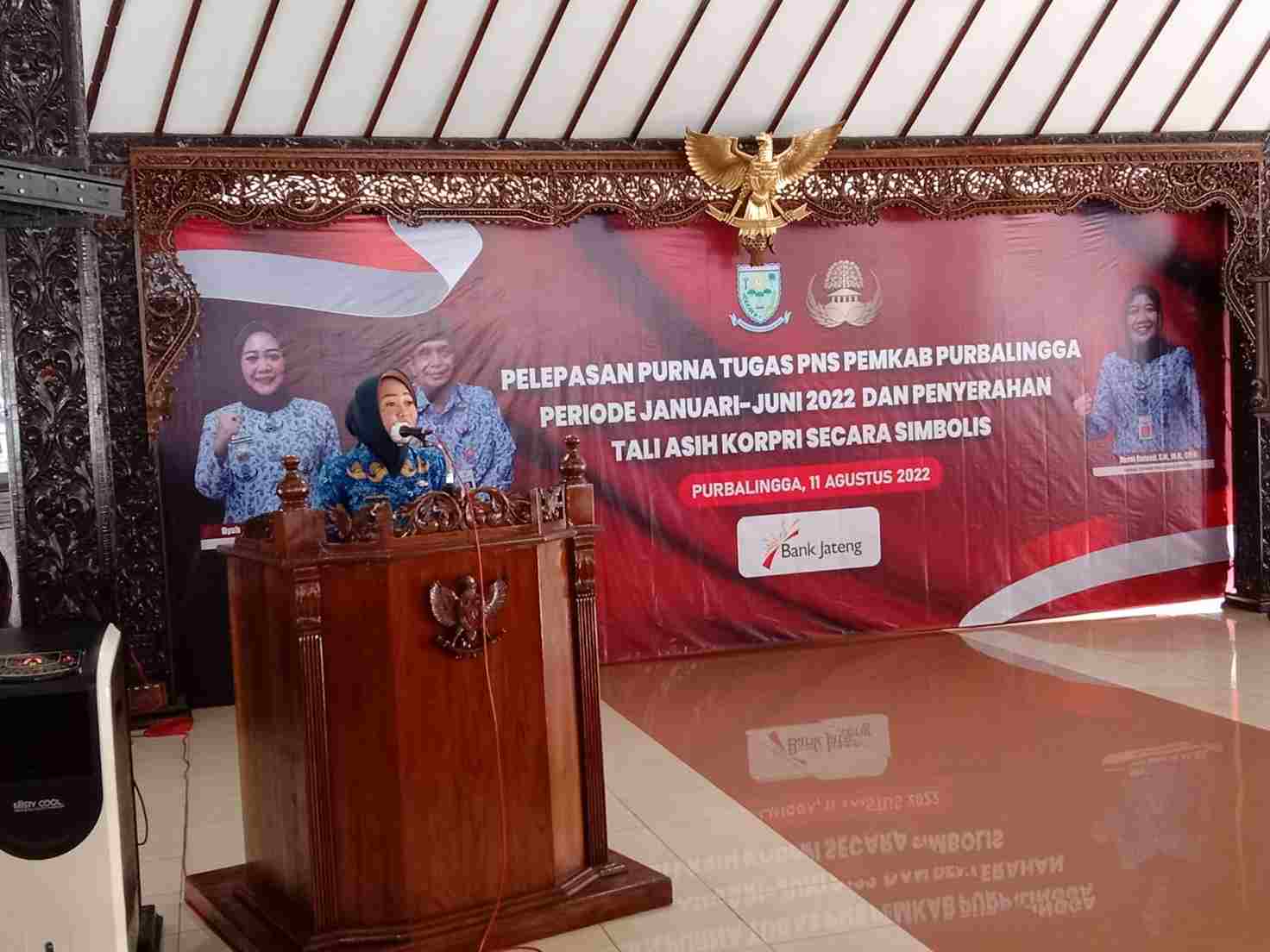 PURBALINGGA INFO- Para purna tugas Korps Pegawai Republik Indonesia (Korpri) Kabupaten Purbalingga diharapkan terus memberikan sumbangsih bagi pembangunan di Kabupaten Purbalingga. Hal tersebut disampaikan Bupati Purbalingga, Dyah Hayuning Pratiwi saat menyampaikan sambutan pada acara pelepasan purna tugas PNS Pemkab Purbalingga Periode Januari-Juni 2022 dan penyerahan tali asih Korpri secara simbolis, Kamis (11/8/2022) di Pendapa Dipokusumo Purbalingga.