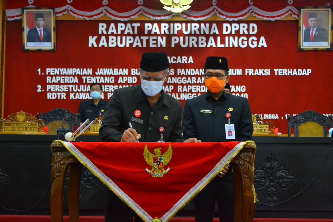 PURBALINGGA – Pemerintah Kabupaten Purbalingga bersama DPRD Kabupaten Purbalingga menyetujui bersama Raperda tentang Rencana Detail Tata Ruang Kawasan Perkotaan Purbalingga Kabupaten Purbalingga Tahun 2020-2040 menjadi Peraturan Daerah. Persetujuan ini ditandai dengan penandatanganan Berita Acara persetujuan bersama antara Ketua DPRD dengan Pjs Bupati pada Rapat Paripurna DPRD, Rabu (11/11) di Ruang rapat DPRD.