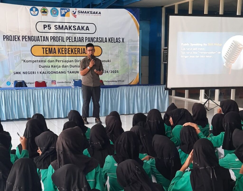 PURBALINGGA – Sebanyak 600 siswa kelas X SMK Negeri 1 Kaligondang mengikuti kegiatan Blok Projek Penguatan Profil Pelajar Pancasila (P5) bertema kebekerjaan, yang digelar selama dua hari pada 14–15 Mei 2025. Bertempat di aula sekolah, kegiatan ini mengusung topik “Kompetensi dan Persiapan Diri untuk Dunia Kerja dan Dunia Industri” dan berfokus pada penguatan soft skill, terutama keterampilan berbicara di depan umum atau public speaking.