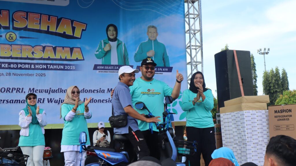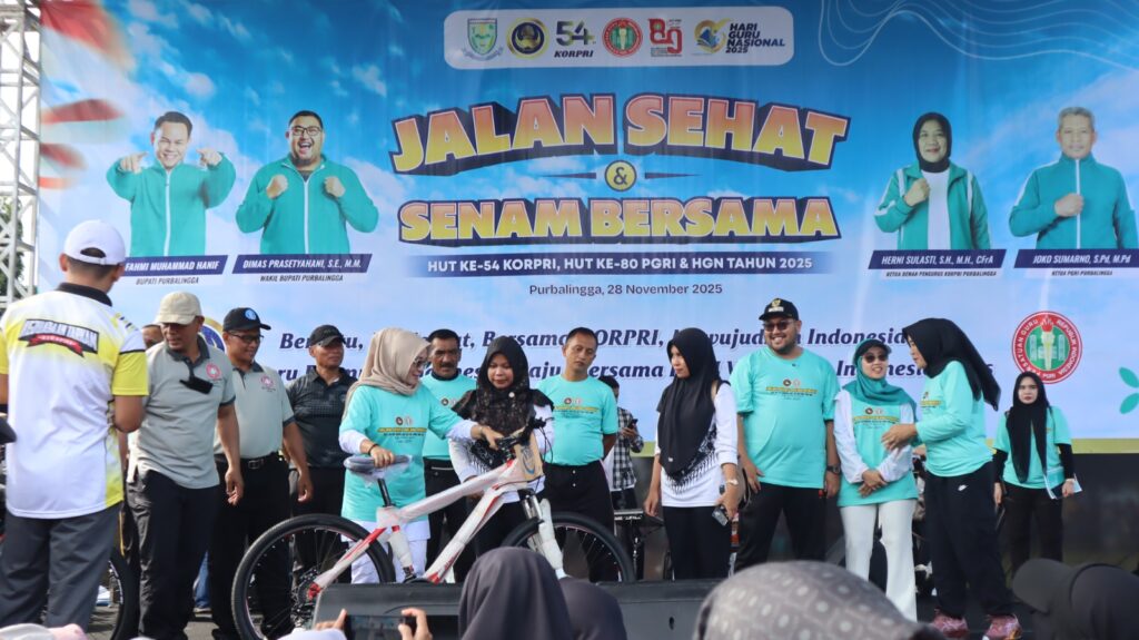 PURBALINGGA INFO – Ribuan peserta memadati Alun-alun Purbalingga mengikuti Jalan Sehat dan Senam Bersama yang digelar untuk memperingati HUT ke-54 KORPRI, HUT ke-80 PGRI, dan Hari Guru Nasional 2025, Jumat (28/11/25). Suasana kian meriah dengan hadirnya berbagai doorprize, mulai dari sepeda motor, sepeda listrik, sepeda, mesin cuci, kompor, dispenser, dan hadiah menarik lainnya.