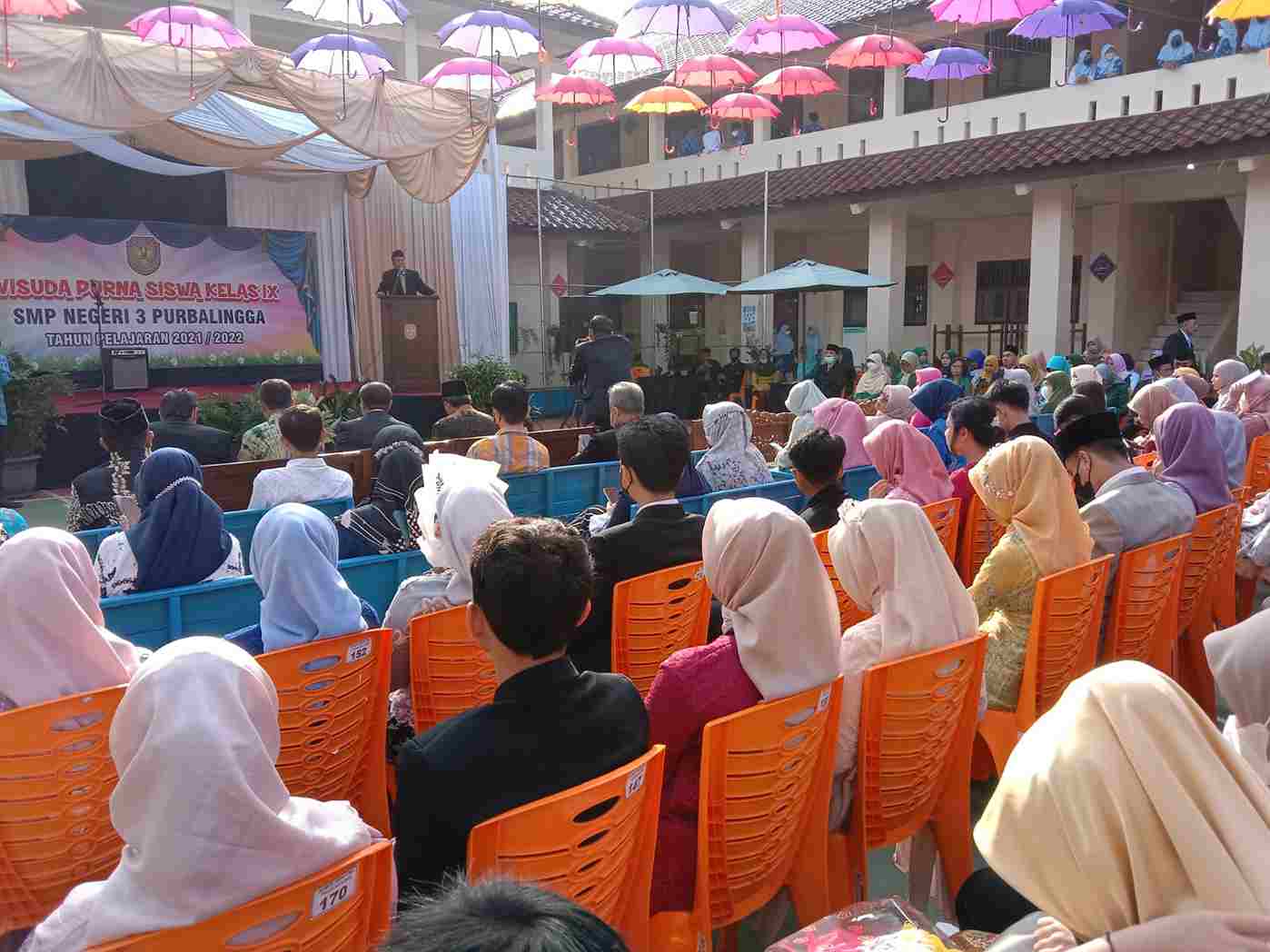 PURBALINGGA INFO- SMP N 3 Purbalingga berhasil meraih prestasi baik bidang akademik maupun non akademik di berbagai tingkatan mulai tingkat Kabupaten, Provinsi dan Nasional. Hal tersebut disampaikan Kepala SMP N 3 Purbalingga, Subarno saat menyampaikan sambutan pada acara Wisuda Purna Siswa Kelas IX, Kamis (16/6/2022) di halaman SMP N 3 Purbalingga.