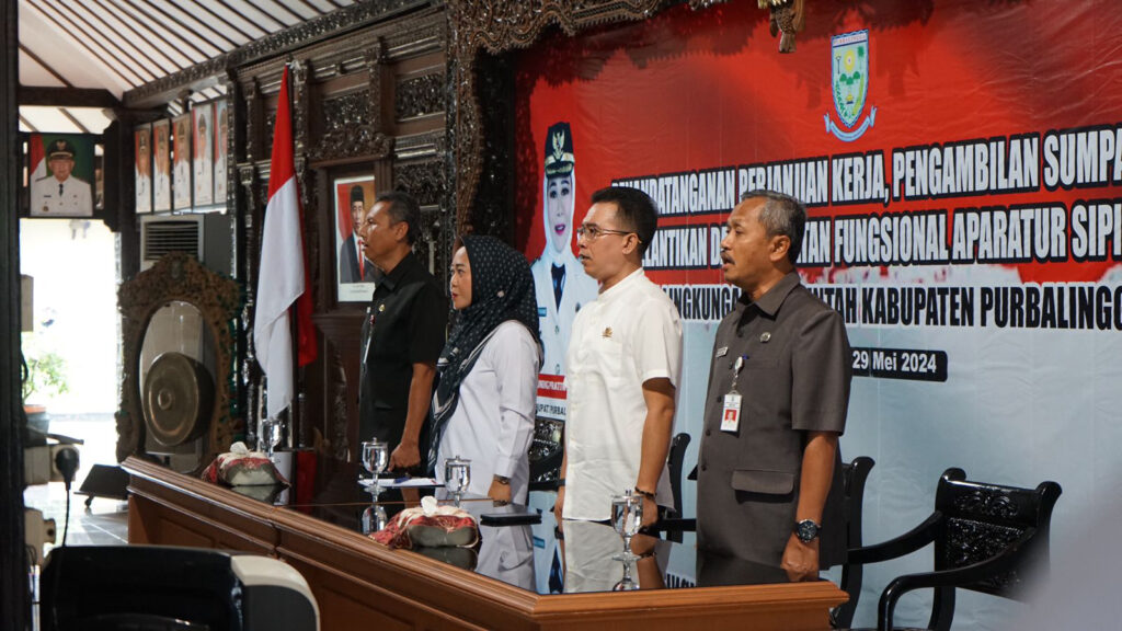 PURBALINGGA – Sejumlah 285 Aparatur Sipil Negara (ASN) Formasi Tahun 2023 resmi dilantik oleh Bupati Purbalingga Dyah Hayuning Pratiwi, pada Rabu (29/5/2024), bertempat di Pendopo Dipokusumo Purbalingga. Seluruhnya terdiri dari 276 Pegawai Pemerintah Dengan Perjanjian Kerja (P3K) di bidang kesehatan, sejumlah 7 P3K Guru, serta 2 ASN jabatan fungsional.