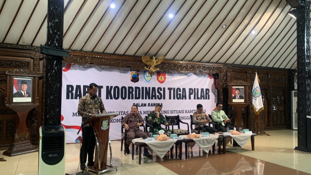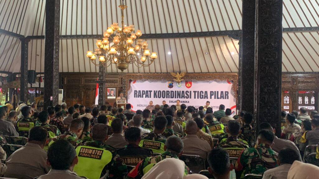 PURBALINGGA INFO – Pemerintah Kabupaten Purbalingga menggelar Rapat Koordinasi (Rakor) Tiga Pilar dalam rangka menjalin sinergitas untuk mewujudkan situasi kamtibmas yang kondusif di Purbalingga, Kamis (21/8/25) di Pendopo Dipokusumo. Kegiatan tersebut turut dihadiri jajaran Forkopimda Kabupaten Purbalingga.