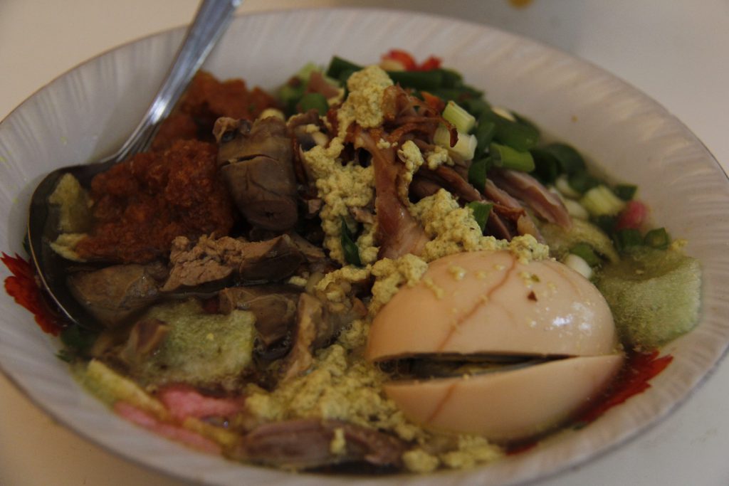 Apalagi jika ditambah satu butir telor rebus dan jeroan. Wow…mantap!