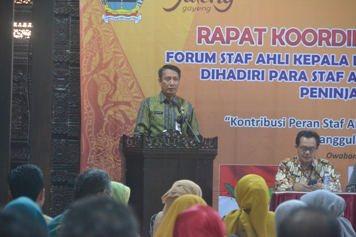 Ia menambahkan, dalam regulasi tersebut juga Staf Ahli bertanggungjawab langsung kepada Kepala Daerah melalui Sekretaris Daerah (Sekda). Ia menjelaskan bahwa Staf Ahli sesuai undang-undang memiliki pangkat Jabatan Pimpinan Tinggi Pratama. “Sebenarnya levelnya sama dengan Sekda di Kabupaten/kota, tapi di pembicaran (keluhan) tunjungannya masih di bawah kelas jabatannya. Itulah nanti di hasil rakor nanti bisa menjadi rekomendasi-rekomendasi untuk dinaikan,” ungkapnya.