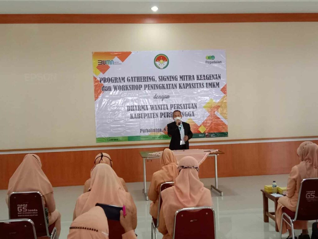 PURBALINGGA, INFO- Guna menstimulasi Usaha Mikro Kecil dan Menengah (UMKM) di Kabupaten Purbalingga pasca Pandemi, Dharma Wanita Persatuan (DWP) dan PT Pegadaian Persero Cabang Purbalingga mengadakan pelatihan kepada pelaku UMKM. Hal tersebut disampaikan ketua DWP Purbalingga, Ny. Dyah Agus Winarno pada acara program Gathering, Signing Mitra Keagenan dan Workshop peningkatan Kapasitas UMKM, Selasa (8/3/2022) di aula PT Pegadaian Persero Cabang Purbalingga.