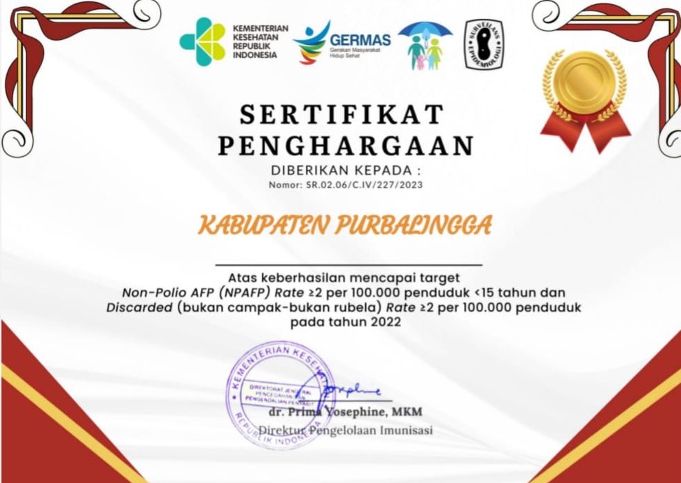 Sertifikat Penghargaan yang diberikan kepada Kabupaten Purbalingga bernomor SR.02.06/C.IV/227/2023 yang diteken oleh Direktur Pengelolaan Imunisasi Kemenkes RI dr. Prima Yosephine, MKM.