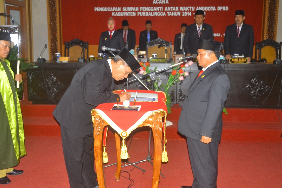 Proses pengambilan sumpah dilaksanakan oleh Ketua DPRD Purbalingga H Tongat SH MM, disaksikan Plt Bupati Purbalingga, Pimpinan DPRD, Pejabat Struktural Pemerintah Kabupaten Purbalingga, Anggota DPRD Purbalingga, Forum Kordinasi Pimpinan Daerah (Forkopimda), Komisi Pemilihan Umum (KPU) Purbalingga dan Bawaslu Purbalingga. Pengambilan sumpah ini guna memenuhi ketentuan konstitusional Peraturan Pemerintah (PP) Republik Indonesia Nomor 12 Tahun 2018 Tentang Pedoman Penyusunan Tata Tertib Dewan Perwakilan Rakyat Daerah Provinsi, Kabupaten, dan Kota.