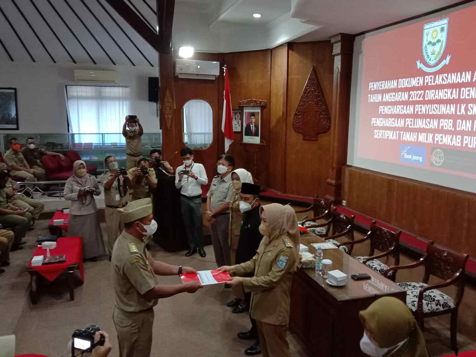 PURBALINGGA, INFO- Karena berhasil melunasi PBB untuk dua kategori berbeda, dua Pemdes (Pemerintah Desa) yaitu Limbasari Kecamatan Bobotsari dan Karangjambe Kecamatan Padamara dihadiahi sepeda motor oleh Pemerintah Kabupaten (Pemkab) Purbalingga. Pemberian hadiah motor tersebut dilakukan dirangkaikan dengan acara penyerahan dokumen pelaksanaan anggaran SKPD tahun anggaran 2022, pemberian penghargaan penyusunan LK SKPD 2020 dan penyerahan sertifikat tanah milik Pemkab Purbalingga, Senin (10/1/2022) di Graha Adiguna komplek Pendopo Dipokusumo Purbalingga.