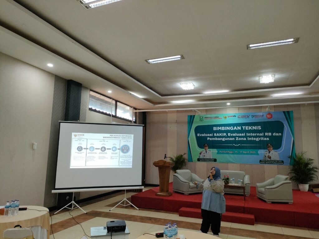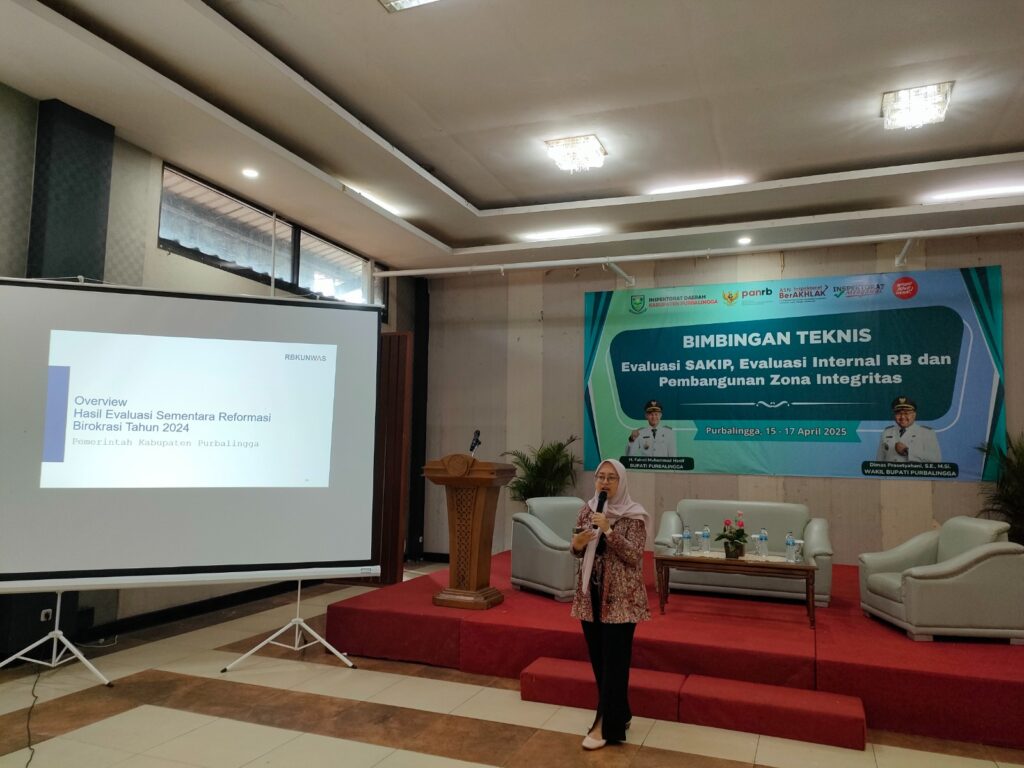 PURBALINGGA – Pemerintah Kabupaten Purbalingga melalui Inspektur Inspektorat Kabupaten Purbalingga fasilitasi pelaksanaan Kegiatan Bimbingan Teknis (BIMTEK) Evaluasi SAKIP, Evaluasi Internal Reformasi Birokrasi (RB) dan Pembangunan Zona Integritas. Pelaksanaan kegiatan ini berlangsung selama tiga hari dimulai dari tanggal 15 April 2025 sampai dengan 17 April 2025 bertempat di ruang rapat PM Collaboration Purbalingga.