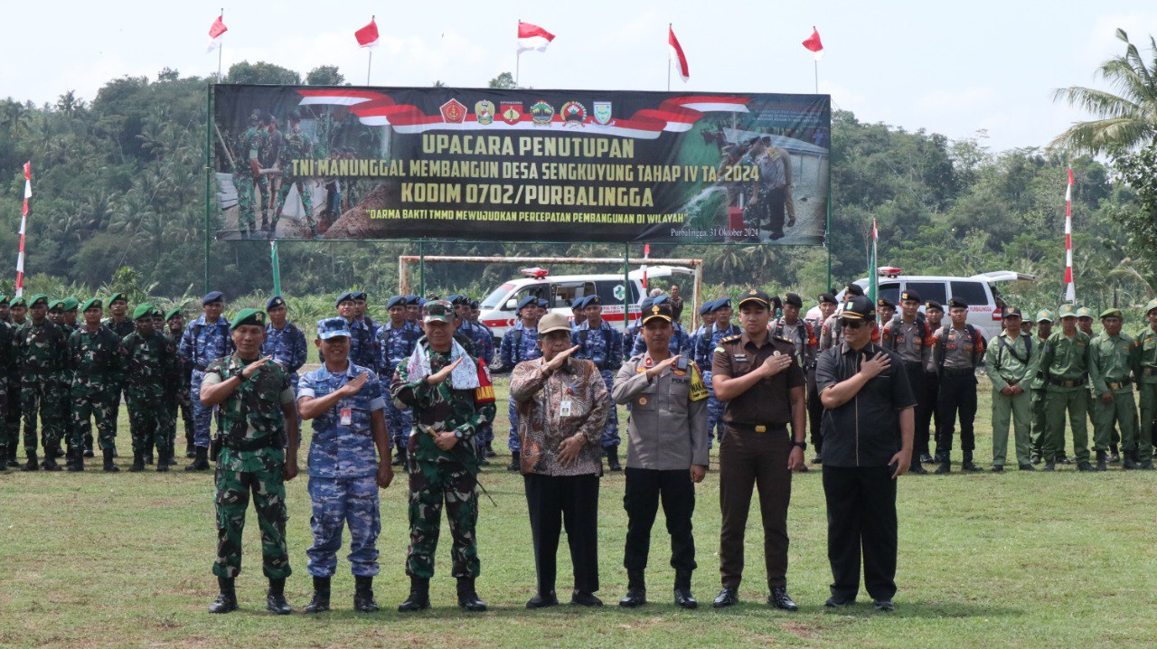 PURBALINGGA – Kegiatan TNI Manunggal Membangun Desa (TMMD) Sengkuyung Tahap IV yang berlangsung di Desa Sindang, Kecamatan Mrebet resmi ditutup, Kamis (31/10/2024). Upacara penutupan TMMD Sengkuyung tahap IV dipimpin oleh Komandan Kodim 0702/Purbalingga Letkol Inf Untung Iswahyudi dan dihadiri oleh Plt Bupati Purbalingga H Sudono, jajaran forkopimda, kepala OPD, forkopimcam, serta masyarakat setempat.