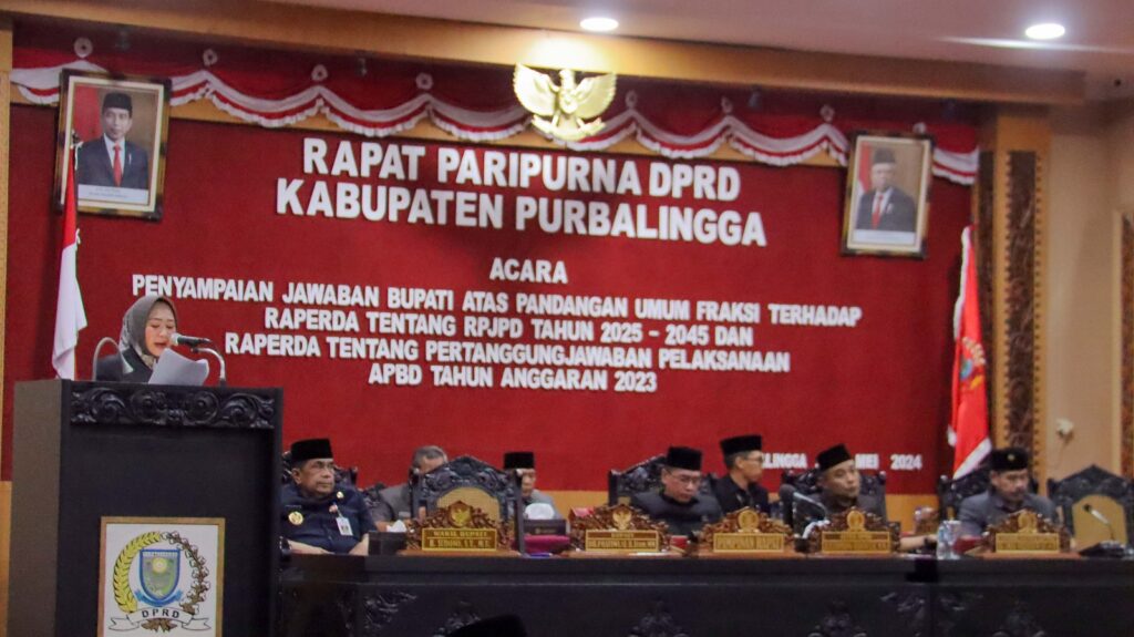 PURBALINGGA INFO – DPRD Kabupaten Purbalingga menyelenggarakan Rapat Paripurna dengan agenda Penyampaian Jawaban Bupati Atas Pandangan Umum Fraksi Terhadap Raperda RPJPD Tahun 2025 – 2045 dan Raperda tentang Pertanggungjawaban Pelaksanaan APBD TA 2023, di Ruang Paripurna DPRD, Jumat (31/5/24).
